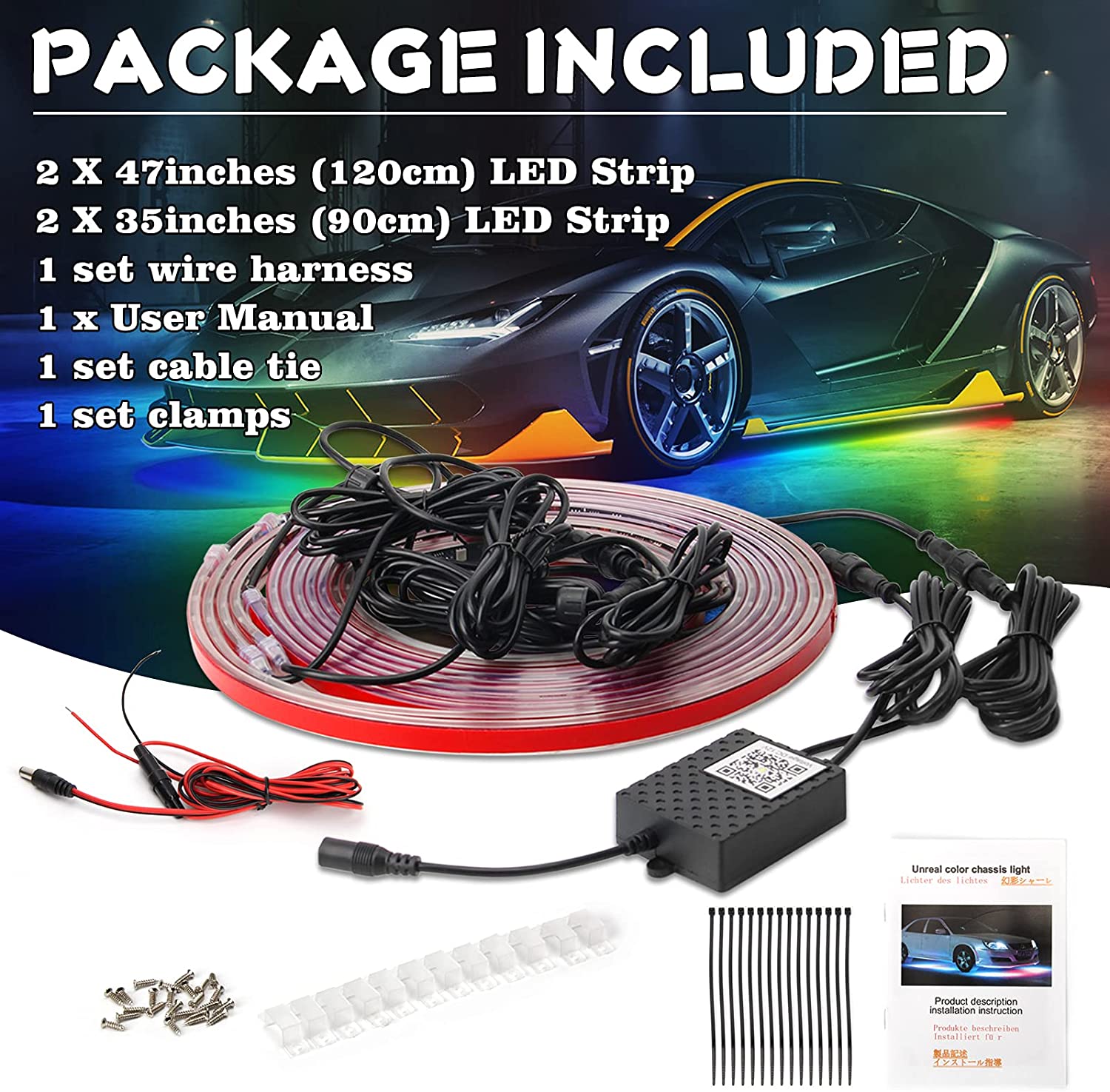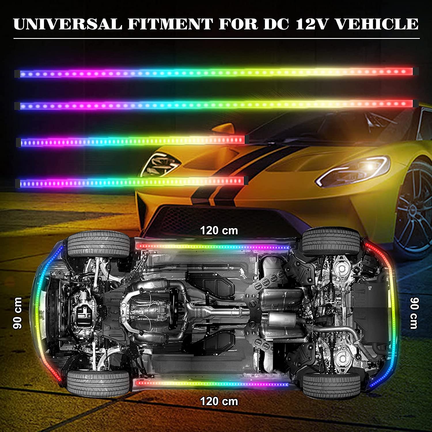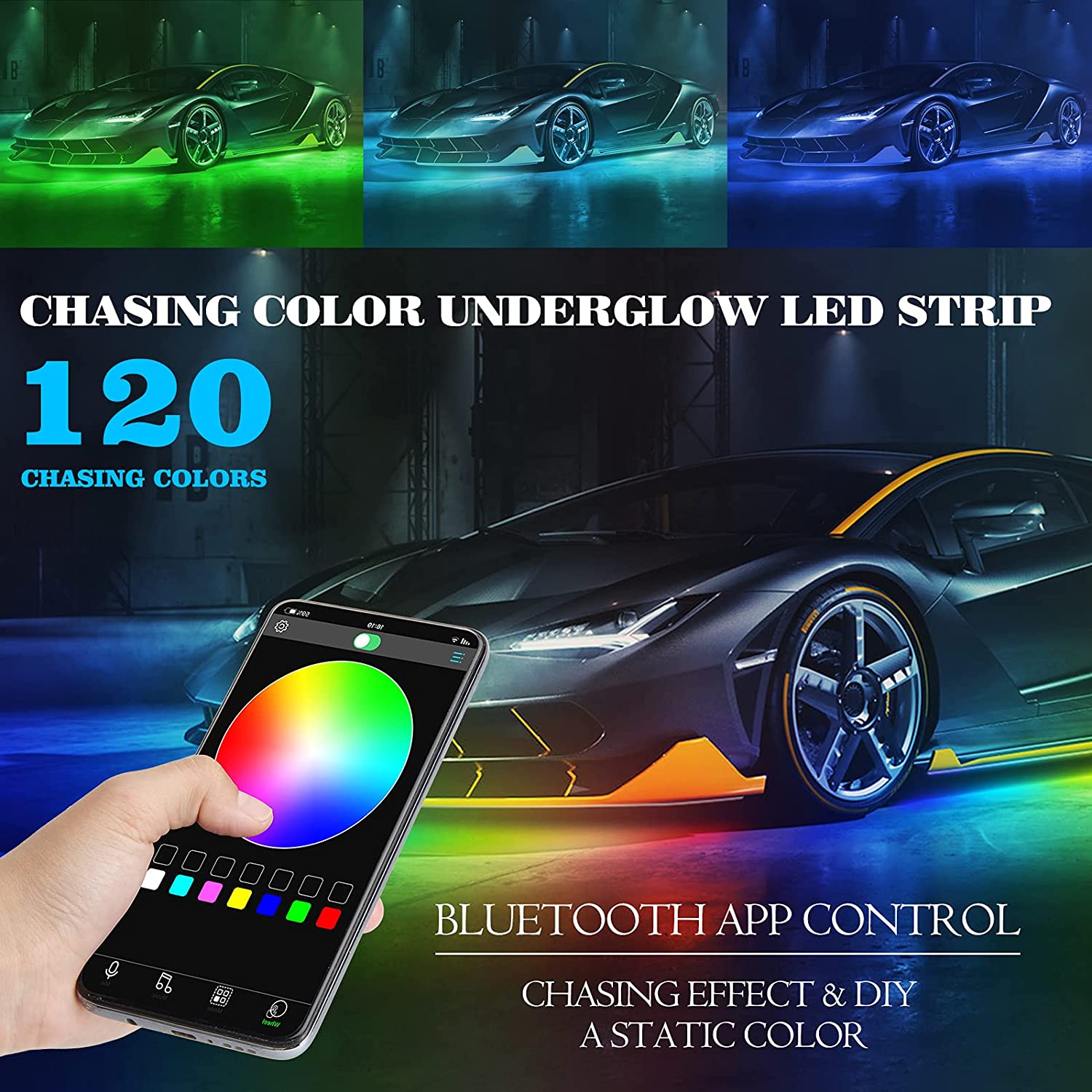 App Control & 16 Million Colors: Our Underglow Lights use wireless APP for control suitable for IOS or Andriod. Choose any color you like from 16 million colors. APP control to turn lights on or off, dim or brighten and even adjust the speed of mode.