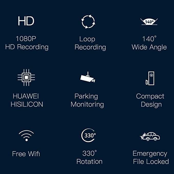 【Crystal Clear Image】Full HD 1080p@30FPS. Hisilicon Hi3516C Main Processor; 2 MP CMOS Image sensor; 6-G lens with 1 Infra-Red filter; F 2.0 large aperture - Captures more light for improved low light videos; Wide Angle 140° enough to cover 4-6 lanes simultaneously.