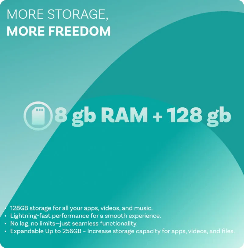 8GB RAM and 128GB storage; microSD expansion up to 256GB for apps and media.