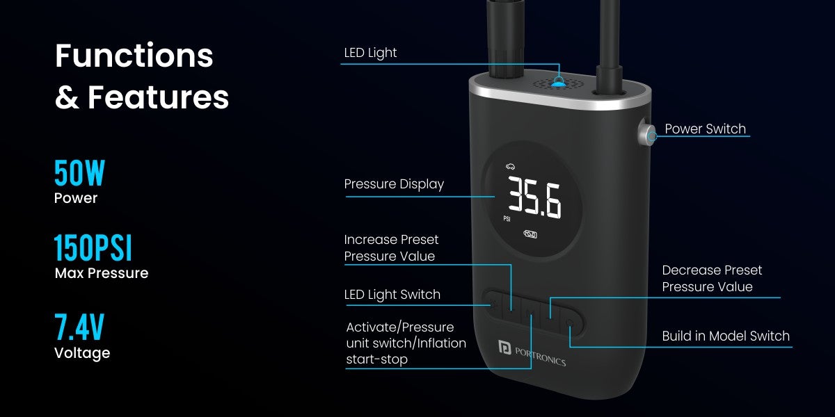 Multiple Nozzles For Multi-Tasking: Portronics VAYU comes with many nozzles of different sizes, shapes and functions and is a Presta Valve adapter enabled model. Combined with the excellent battery power and output, it can inflate the tires of most vehicles (bicycles, bikes and cars) and sporting equipment (footballs or basketballs) in a matter of moments.
